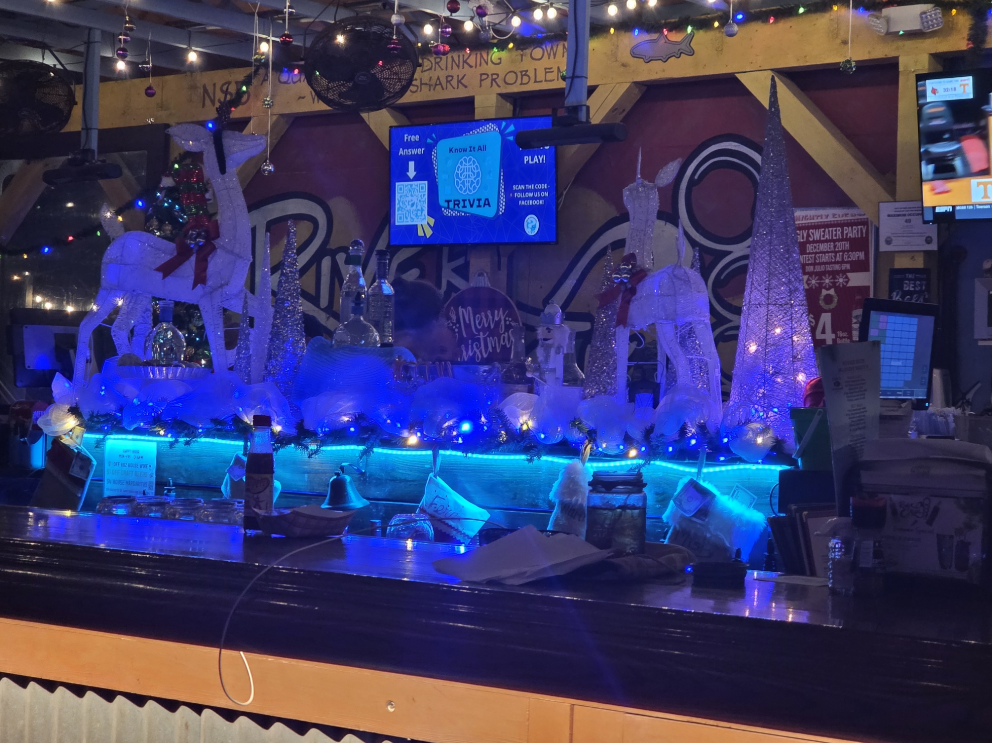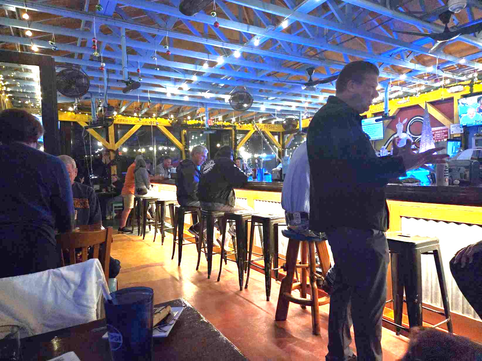 Leaving Marineland we headed for an anchorage in Daytona for a quick layover before out next stop in Titusville. Easy running day of about 35 miles, but when we got to Daytona the anchorages were full so we kept moving to Rockhouse Creek, a favorite spot of ours. A dredger was in the area and had been working. It appears he closed off the creek. I tried several times to get into the creek without any luck. The water shoaled too much for passage. Luckily, we had plenty of daylight left after having two no-gos on a place to stop, so we proceeded to New Smyrna and the City Marina — they had an unfilled slip, so we took it. We’ve passed by this town many times, but I’ve only stopped once before, in 2005 with my brother-in-law Barny while on the Great Loop. The River Deck restaurant was recommended by marina staff, so, after getting the boat settled, we headed there. A real treat. It was trivia night and the party was lively! Folks were friendly and food was delicious. Made some new friends but didn’t fare too well at trivia.