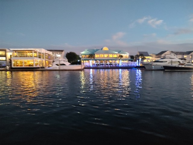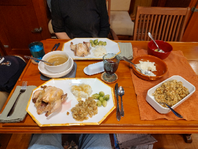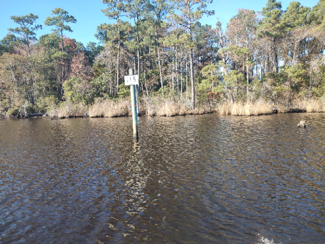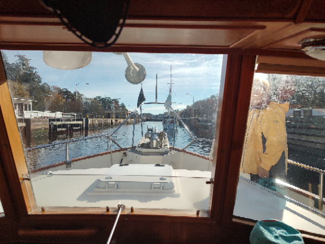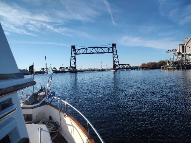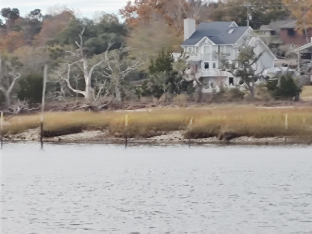 As mentioned, we’re in Beaufort NC for the Thanksgiving holiday. Wednesday we relaxed and went to the store for last-minute items for the Thanksgiving feast. We also enjoyed a beautiful sunset over some gorgeous sailboats. Thursday was a special day — Carey made an exceptional dinner and the two of us enjoyed each other’s company and the food. We also enjoyed listening to the start of a Beaufort tradition — the 5K Gobble Walk that allows young, old, and everybody in between. And it was a good stop as the winds blew 15 to 20 knots — not a good day for traveling. Friday arrived with light winds and plenty of sunshine, but still cold. We got underway at 7 AM and started the 70-mile trip to Wrightsville Beach, NC. You’ll see some of the sights along our way below. What can’t be shown in pictures is the great navigation day we had. We traveled the 70 miles managing 3 bridges that had to open for our air height but only opened on the hour and half-hour and two very shallow inlet areas in the ICW. One of those we had to travel at dead low tide. A nail-biter but we made it through. We arrived at Wrightsville Beach at 4 PM and you see some of the lights of the evening as in the last picture. We had our best meal of the trip so far (and most expensive) at the restaurant at the Bridge Tender Marina, where we had stopped for the night. After dinner, back to the boat to get ready for tomorrow’s trip to Myrtle Beach and Barefoot Landing Marina.