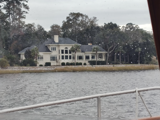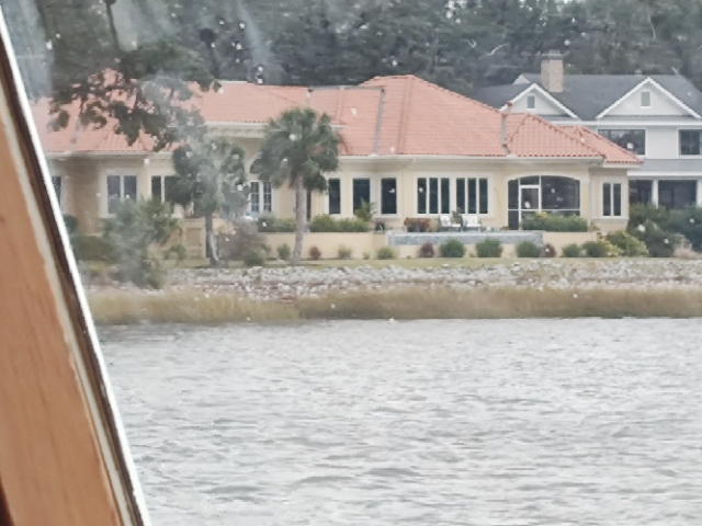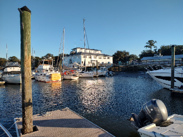 Worried about the travel time today, we pulled out of Isle of Palm at 7:15 heading south to Beaufort, SC, an 80-mile trip. We passed through Charleston Harbor, through Elliot Cut, and meandered through the Ashley River, the Stono River, the South Edisto River, the Coosaw River, the Ashepoo River, and probably several other smaller rivers as we traversed this section of South Carolina. There were several very skinny water sections in this portion but we lucked out. The timing of our travel had us at or near high tide for all the worst spots. We loved it, sat back and enjoyed the views. The tides were also our friend today as they were strong (plus 2 knots) in our direction more than against. We made the trip averaging 10 mpg, more than we had planned. Tied up and relaxing by 3:30 was the result. It allowed us time to get ready for a great meal at Dockside, not the one in Colonial Beach, but a true competitor of our hometown place.