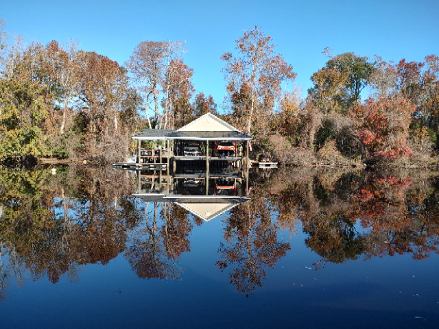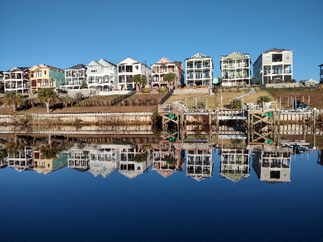 We cruised at a comfortable 10 mph for just over 5 hours and pulled into our slip at Harborwalk Marina. We noticed a building spree as new homes continued to be built along the waterway. People love the water and live in all sorts of homes — see some below. It was a quiet and uneventful trip and we pass on a few pictures. Georgetown is one of our favorite stops and it didn’t disappoint. We walked through the beautiful holiday-decorated historic waterfront town on our way to a scrumptious dinner. Delightful day and evening! Now headed to the Isle of Palms just above Charleston harbor, meandering thru the lowlands on our way.