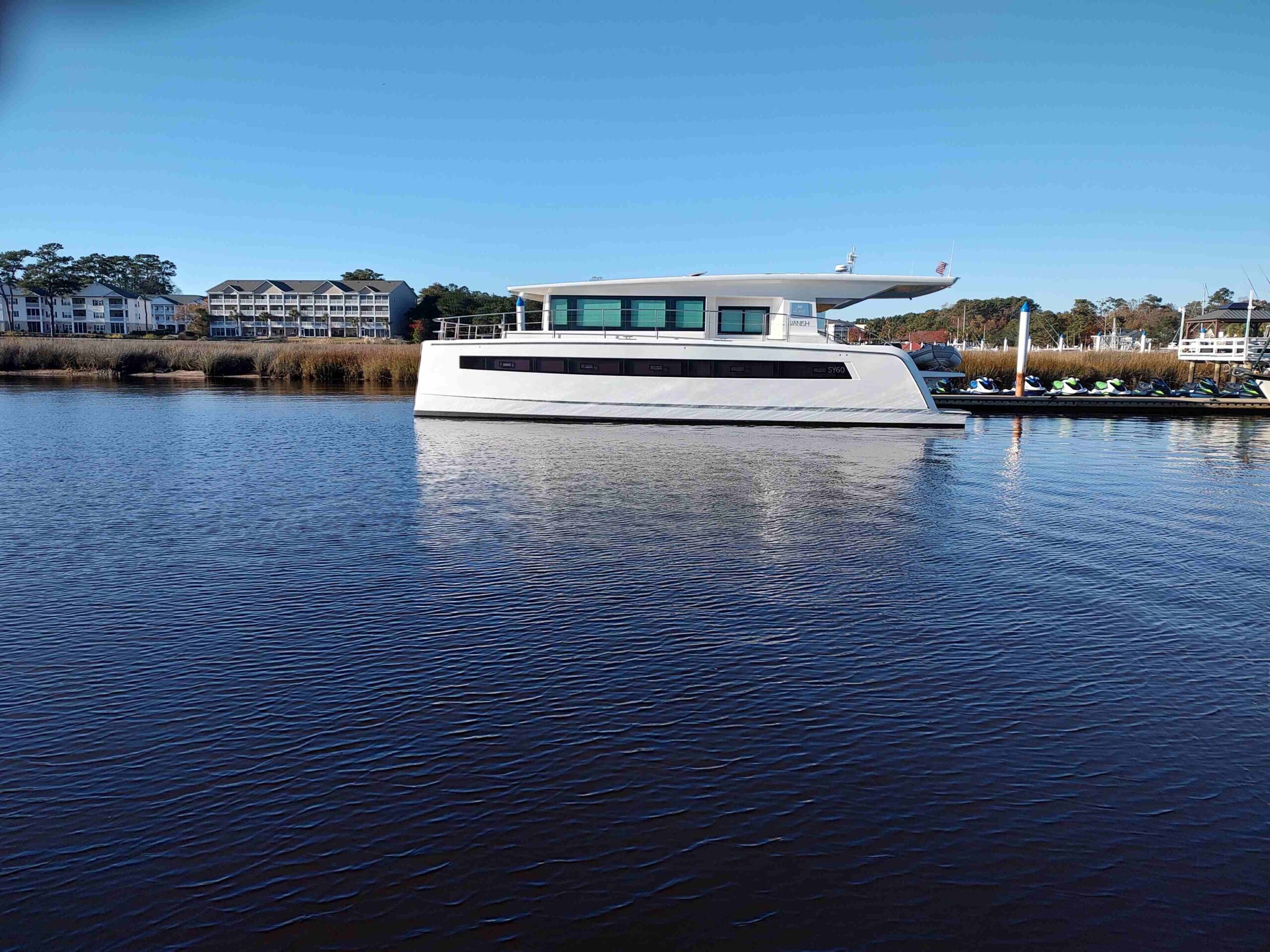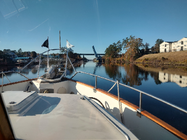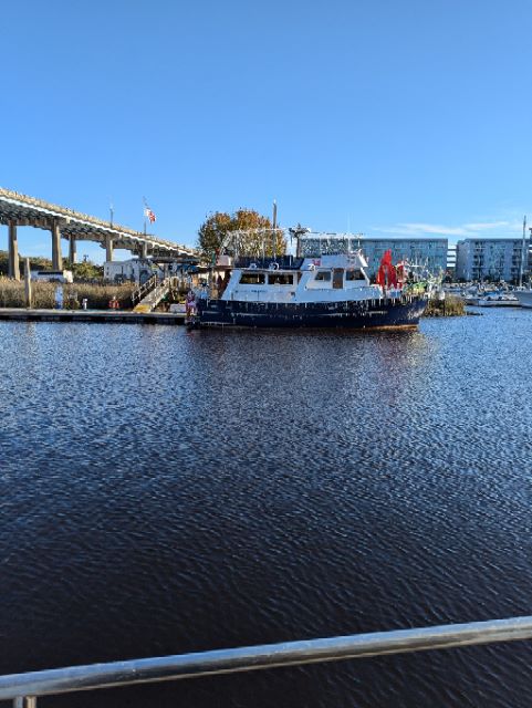 We slept in today — up at 7 AM and underway an hour later. It was 31 degrees on deck but we got the electric cable and lines onboard and were off to Myrtle Beach. It was a 72 statue mile trip through the lower portion of the Cape Fear River, then two known shallow sections of the ICW that have taken some paint off the hulls of many boats (Lockwood’s Folley and Shallotte Inlet in NC). Our schedule indicated going through these two areas at near low tide. What fun! We made it through — and I wish I could show in photos what it’s like twisting and turning through a shallow inlet from the ocean as the sands beneath the water keep changing. A fun event. After these events we passed through “the Rock Pile,” a section of the ICW that surprised the government developing the ICW. This was an approximate five- mile section of the ICW that was solid rock. The digging caused added cost and time so it has less width than the rest of the ICW and on the shoreline heavy rocks can catch a less than watchful Captain navigating this section. As we closed in on Myrtle Beach we noticed preparations for an ICW Christmas Lighted Boat Parade in North Myrtle Beach. Over 50 boats participated. We moored past the parade route so we only saw a couple of boats preparing and one coming past after the parade. We ate aboard and tried to clean the boat with no water on the docks. But, this morning, we were delighted to find the star of the parade, the Barefoot Queen paddle boat, moored behind us. Wonderfully decorated! Moving on, we’re headed to Georgetown, one of our favorite spots and where we’ve spent Christmas aboard in the past. Below are some pictures from today.