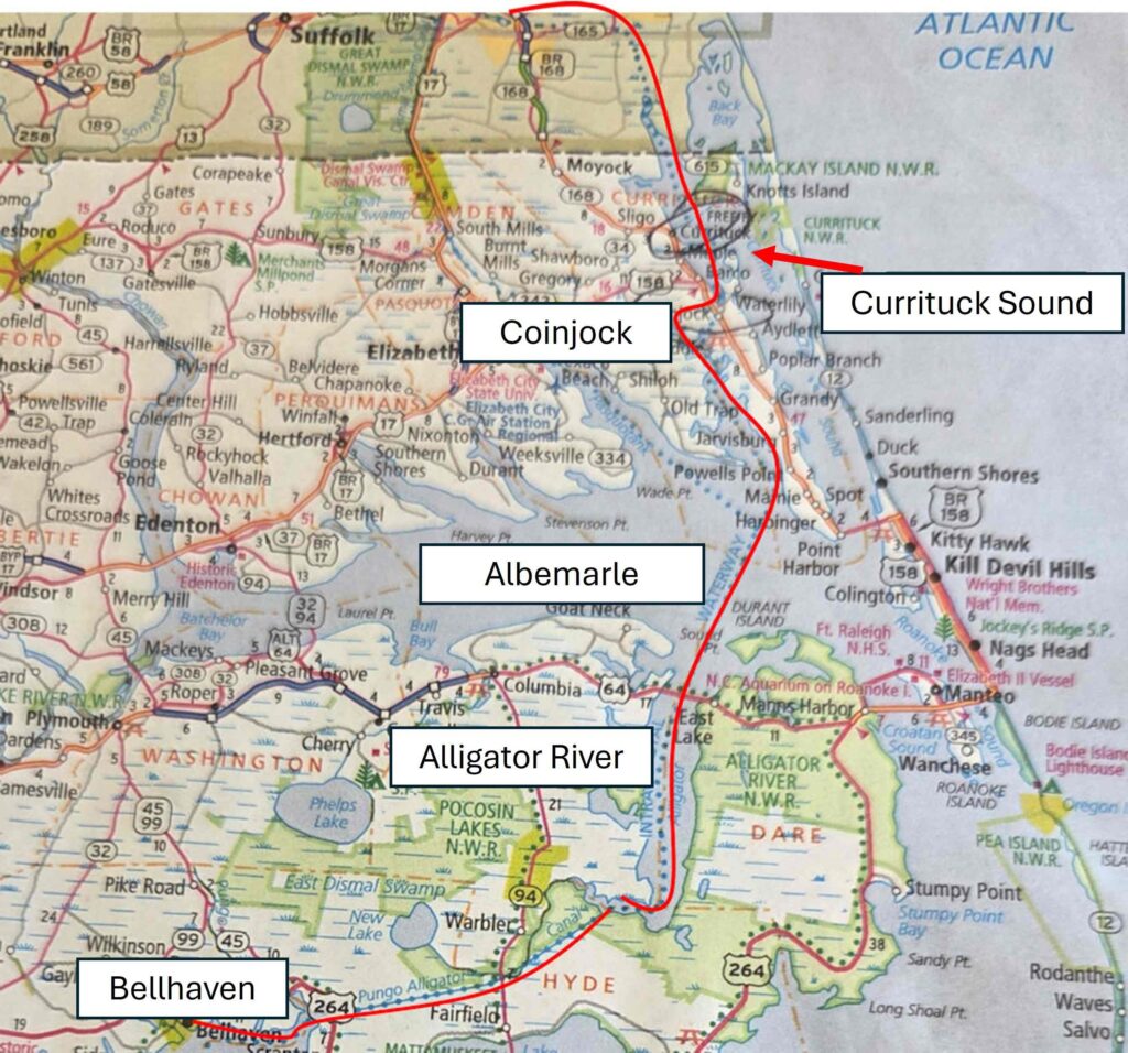 A bright, sunny morning greeted us as we prepared for a longer leg of the journey. At 7 AM, we departed Coinjock, bound for Belhaven, NC—an 80-mile run that would carry us through a variety of waterways.